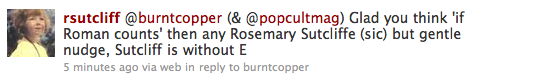 I am still trying at every opportunity to nudge people who mis-spell Rosemary Sutcliff (sic) with an E as Sutcliffe (wrong!) to get it right and put it right. Hence today on Twitter: