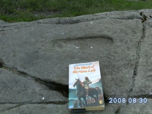 Royce Watson posted at the Rosemary Sutcliff page on Facebook a picture he took a few years ago when he was on holiday in Scotland. He wrote:”It’s the footprint on the coronation stone at Dunadd Fort, as mentioned in the book (The Eagle of the Ninth). Enjoyed the book, big fan.” Eagle eyed Anne, who is, to my shame, much sharper-eyed and more knowledgeable than I on most matters Rosemary, corrects us both, that it’s in The Mark of the Horse Lord in a Dal Riada coronation ceremony.