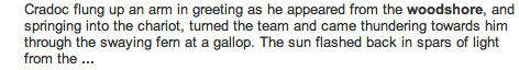 A blog entry elsewhere reminded me of one of the many evocative phrases Rosemary Sutcliff used in her work: ‘wood-shore’. I thought, like Tom Bradman, that it was in Warrior Scarlet. But in fact it appears (?also) in the Lantern Bearers (“Take him out to the wood-shore and bind him to a tree”) and searching Google immediately reveals it, presented as ‘woodshore’, in several places in the paperback OUP edition of The Eagle of the Ninth .