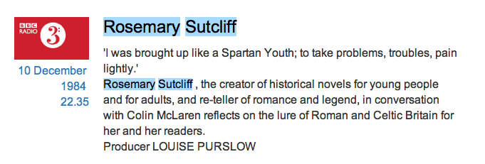 The BBC Genome project is a fascinating source of informatyion that is new to me about Rosemary Sutcliff’s contributions to BBC Radio and Television, and about versions of her books created for radio in particular.