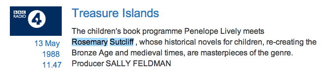 In 1988 Rosemary Sutcliff was interviewed on BBC Radio 4 by Penelope Lively in children’s book programme Treasure Islands