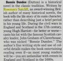 In a brief review in The Dallas Morning News in 1985 (12 May) Cherie Clodfelter commented that the historical novel for children and young adults, Bonnie Dundee by Rosemary Sutcliff (published in USA by Dutton) was: