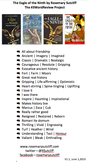Latest collection of reviews in three words of Rosemary Sutcliff’s internationally-acclaimed historical novel for ‘children aged 8 to 88’ (her phrase), The Eagle of the Ninth (her ‘best beloved book’), set in Roman Britain. Interesting that very few words have been used more than once. (I’ve excluded names and places):